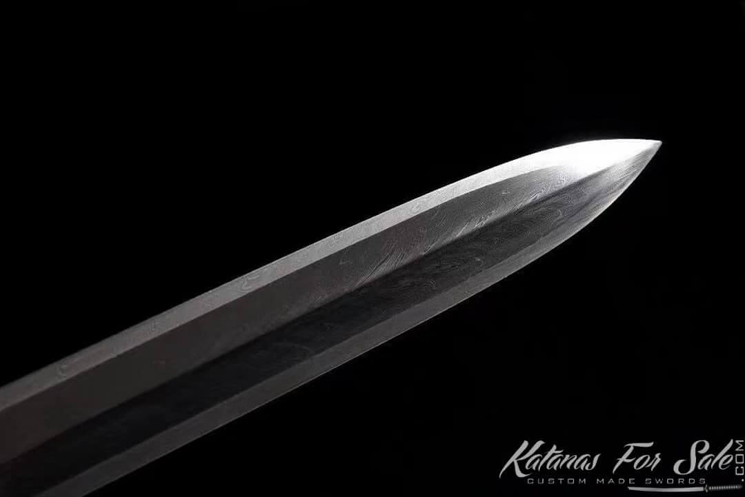 This Chinese Jian sword is made of 1095 Folded Carbon Steel, featuering Ebony wood Scabbard with handmade metal fittings. the Jian has Double Bohi and Ebony wood handle.