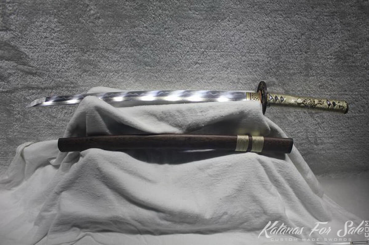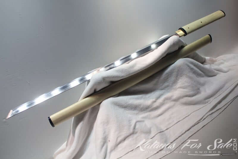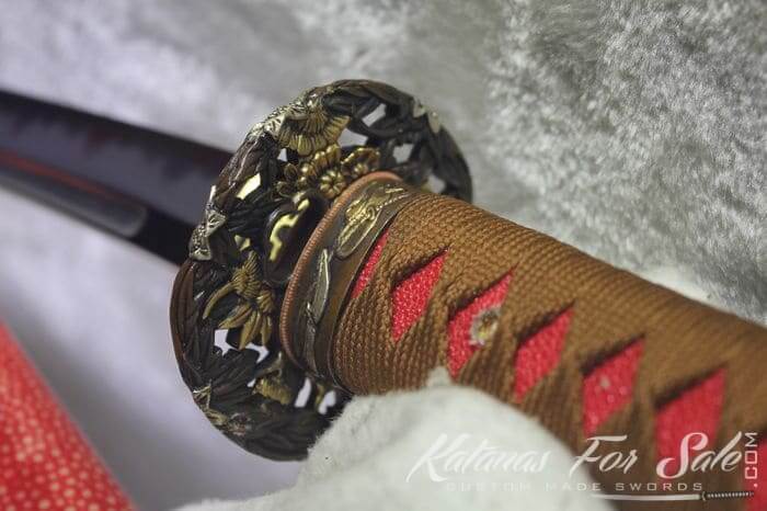 El balance de la hoja es perfecto y la espada es completamente funcional. Puede ser usada para perforaciones, practicas, y Tameshigiri (test de corte). El mango está asegurado por dos mekugis de bambú. El saya encaja sin problemas en la hoja.