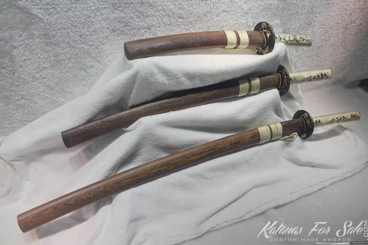Estas viendo un set duo de Katana y Wakizashi hecho de Acero T10 Plegado y Templado a la Arcilla con Pulido Hadori. El Saya para ambas espadas es por completo de piel de raya negra con incrustaciones de cuerno de búfalo. El Ito del set Daisho de espadas Samurái es de seda y está envuelto sobre un Samegawa blanco de piel de raya.