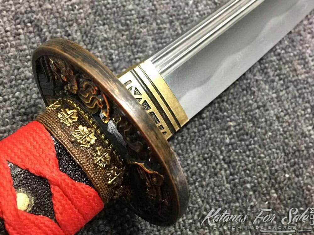This Japanese Katana sword is made of Folded Clay Tempered Acero Tamahagane with Hadori Polish, The Saya is Hand painted dragon with Black buffalo horns ends. the sword blade features Bohi and the handle is black leather wrap with black ray skin Samegawa.