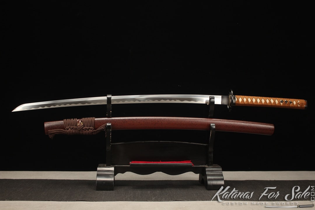 Sakabato Katana Reverse Blade made of 9260 Spring Steel with Brown Black Hardwood Saya. The handle is Light Brown Silk Wrap with White Samegawa