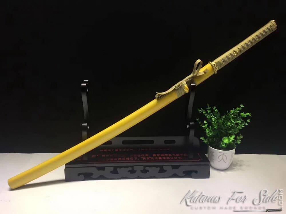 This Gold blade Samurai Katana is made of T10 Acero Templado a la Arcilla, The Saya is yellow lacquered wood. the blade features a fuller (bohi) and the Tsuka is gold rayon silk wrap with white ray skin Samegawa.