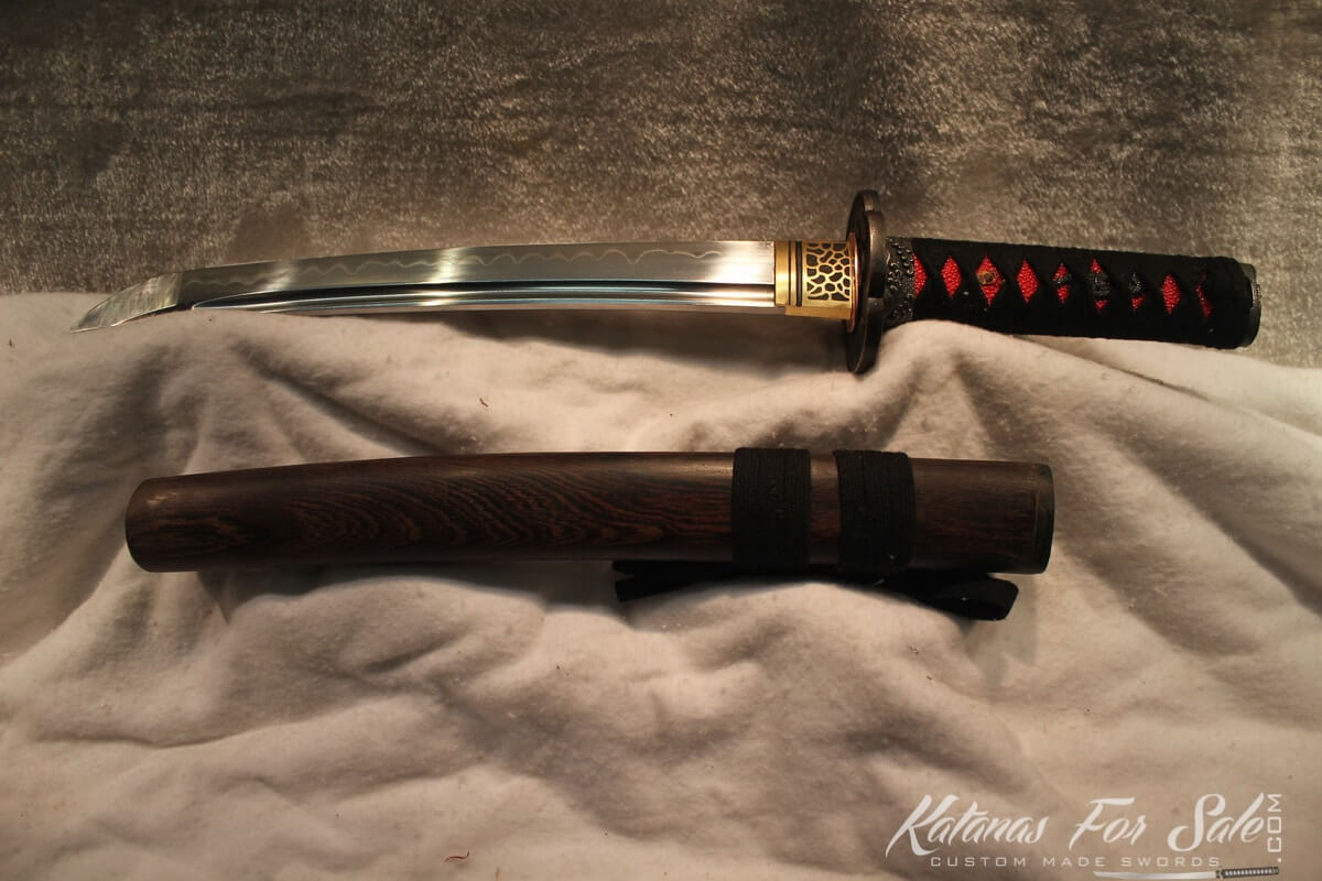 - Tsuka: The habaki is brass. The tsuba is has a Japanese Warrior design, the fuchi and kashira are also a matching Warrior design, built for comfort and quickness. The ito is black silk with alternating criss-cross pattern over red ray skin samegawa. The tang is double pinned with bamboo mekugi.